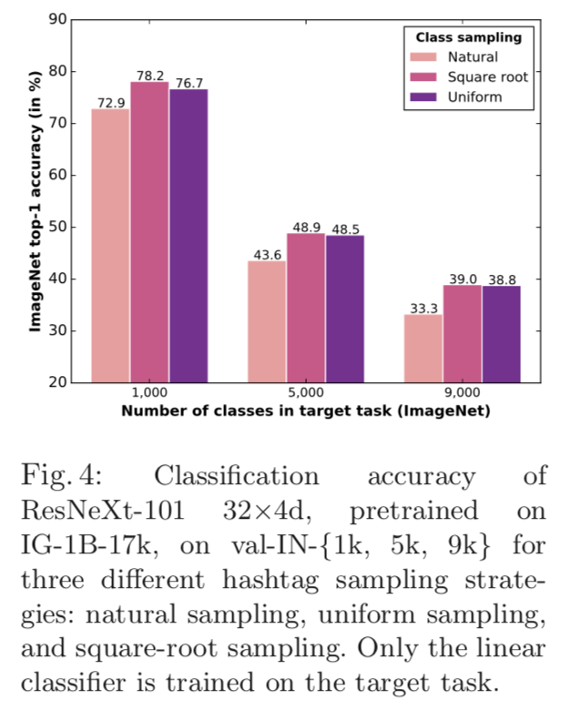 在ImageNet 1000类分类的分类任务上,使用3.5B的数据训练的模型,在迁移到1000类的分类上,提升了4.8%的top1准确率。